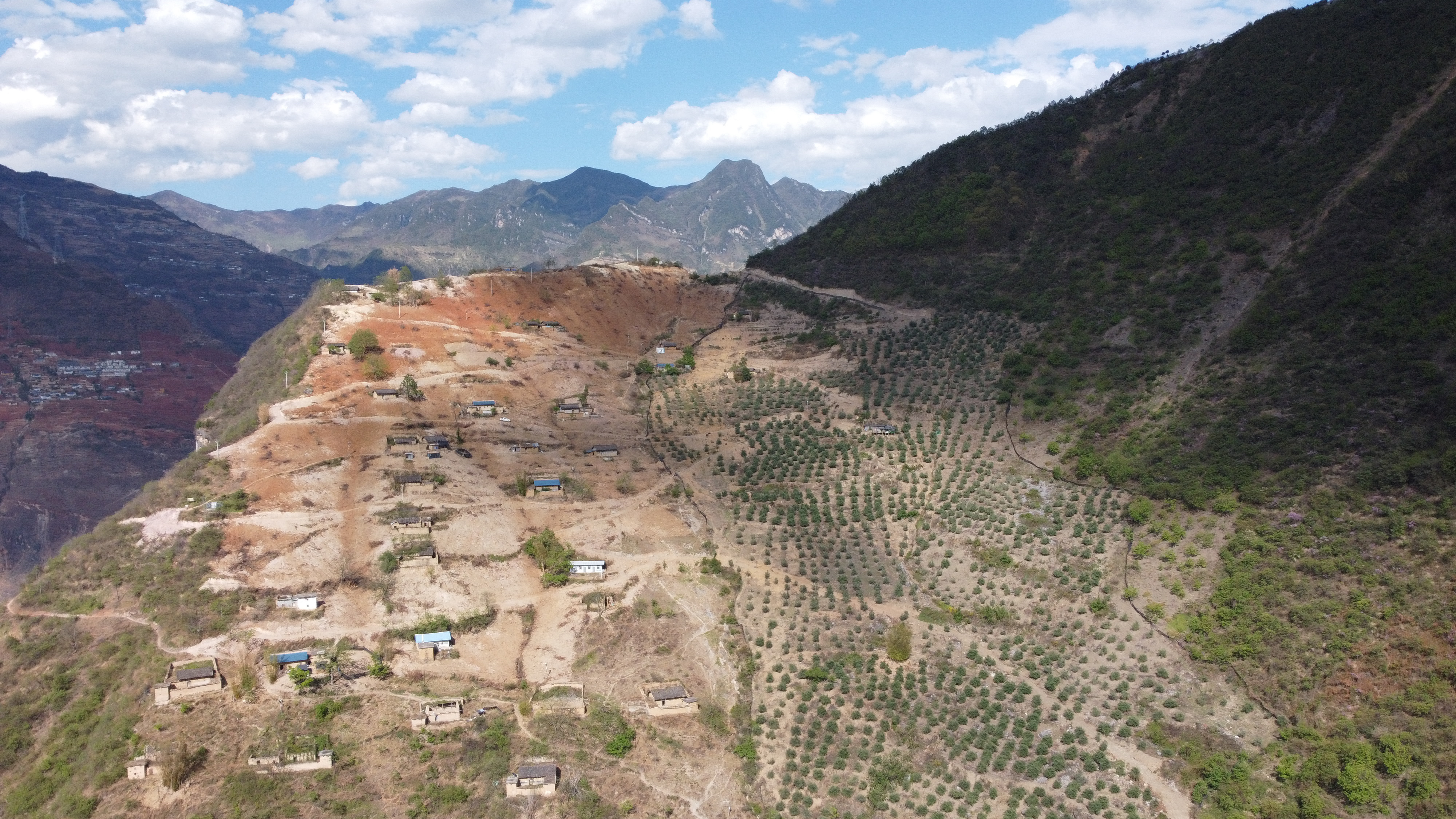 俯瞰悬崖村油橄榄基地(无人机照片)。新华社记者 尹恒 摄