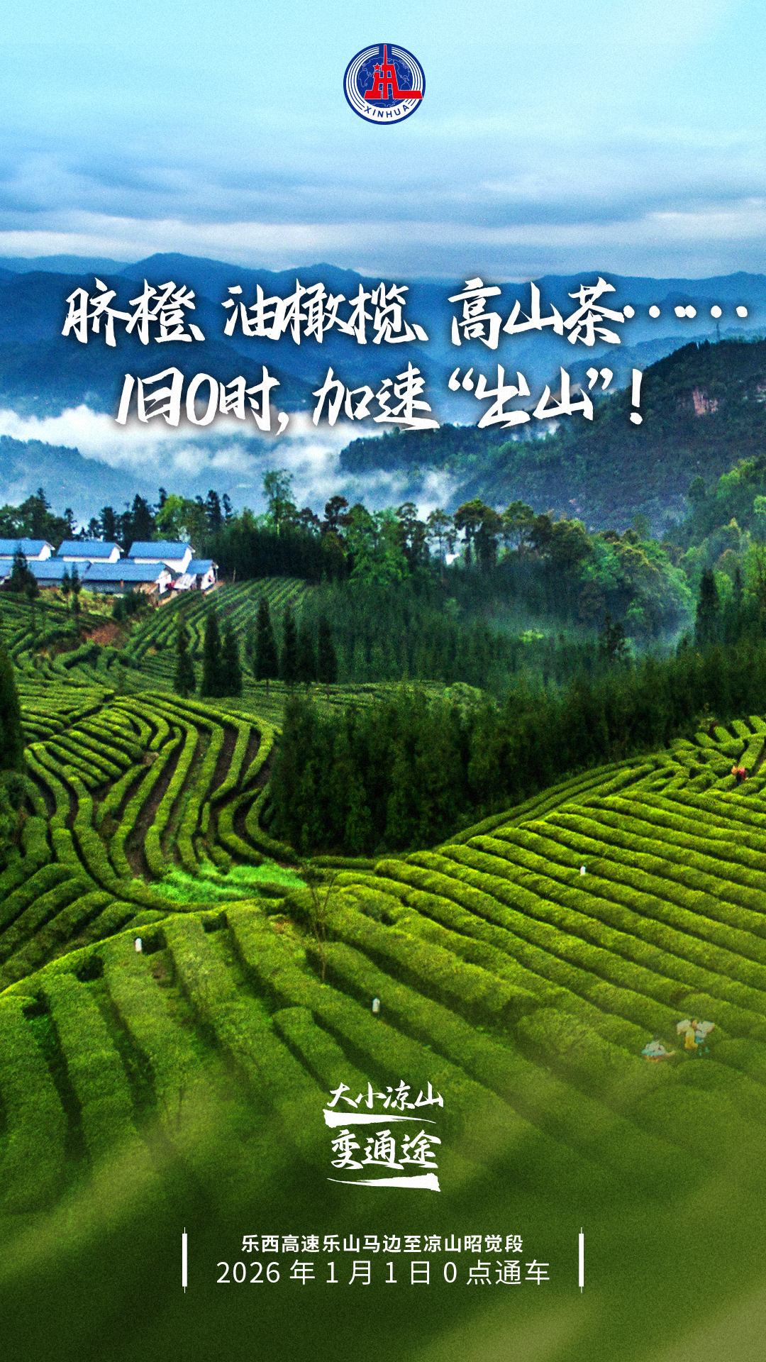 新华社成都12月31日电(记者吴光于、尹恒、胡旭)位于四川西南的乐山至西昌高速公路马边至昭觉段(简称“乐西高速马昭段”)将于2026年1月1日0时通车,让大小凉山地区实现高速公路联通,凉山彝族自治州昭觉县悬崖村的油橄榄、雷波县的脐橙,乐山市马边彝族自治县的高山茶等特色农产品迎来“出山入海”的黄金机遇,为大小凉山彝乡全面推进乡村振兴注入强劲动能。