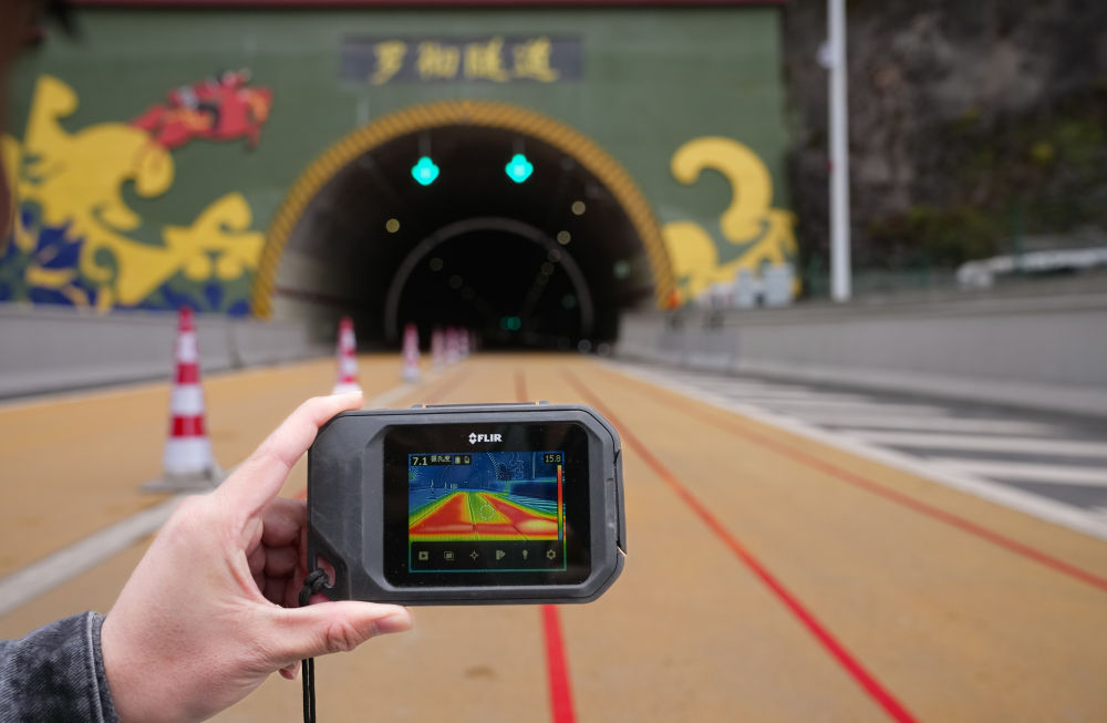 12月26日,工作人员在用热成像仪测试乐西高速罗彻隧道口使用环路热管融雪系统效果,结果显示该路面温度明显高于其他地方。新华社记者 江宏景摄
